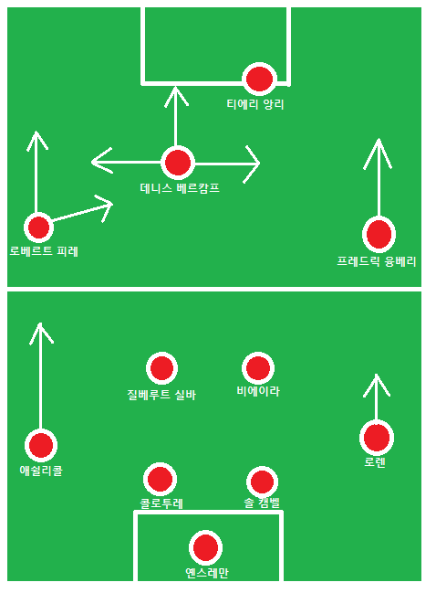 프리미어리그 4회 득점왕의 프랑스 공격수 티에리 앙리와 이젠 네덜란드의 전설이 된 세컨 스트라이커의 교과서 데니스. 세계 최고의 공격수 두명이 버티고 있는 아스날의 투톱은 당시 어느 클럽을 봐도 최고라 할 수 있을 것이다. 아스날 무패우승 스쿼드 맞춰봤습니다.