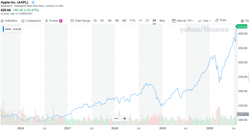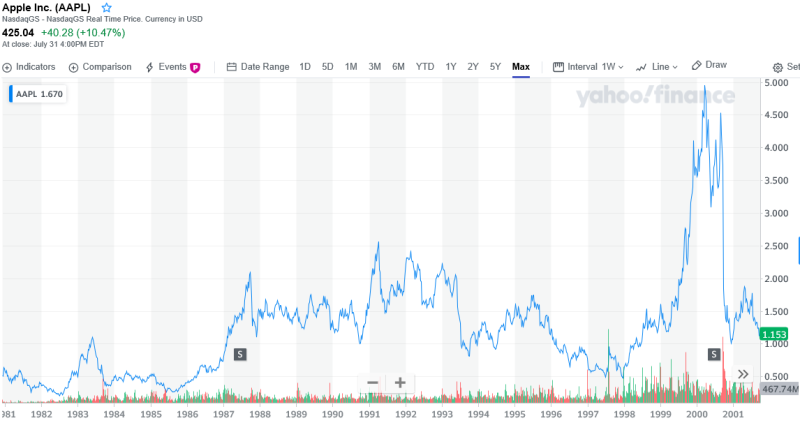 애플 주가 오르는 이유. 애플 40년 주가 출처. 애플이 미국 주식시장에서 차지하는 비중이 점점 커지고 있는데 다우지수에선 오히려 영향력이 줄어들게 되기 때문이다. 애플 주가가 저평가인 이유.